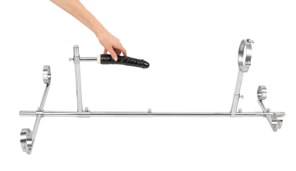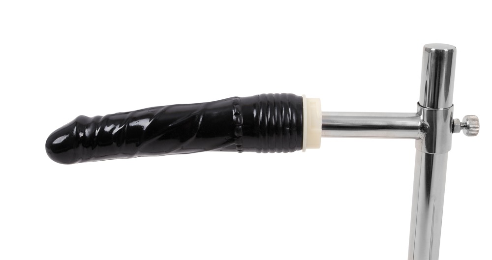 Weiteres Zubehör ist die Halterung für den beiliegenden Dildo, die variabel hinter der/dem knieenden Sub arretiert werden kann.