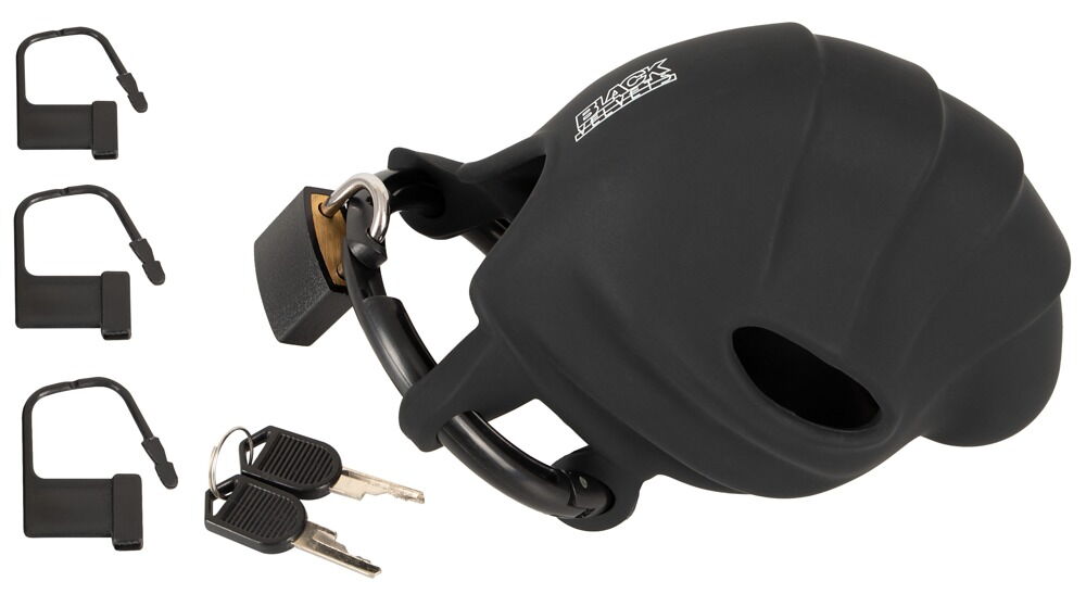 Der Silikon-Keuschheitskäfig Cock & ball cage von Black Velvets schließt Penis und Hoden aufregend ein. Perfekt auf die männliche Anatomie abgestimmt, lässt sich der flexible Käfig leicht an- und ablegen. Das samtig softe Silikon passt sich optimal und komfortabel an. Ein fester Ring hält den leichten Silikon-Käfig fest und sicher am Gemächt. Durch eine untere Öffnung ist urinieren möglich. Selbstverständlich ist der Penis-/Hodenkäfig abschließbar – 1 Vorhängeschloss mit Schlüsseln sowie 3 Einwegschlösser sind inklusive.